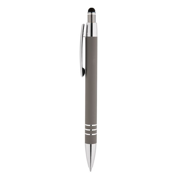 De balpen Celena heeft een handige stylus op de drukknop, waarmee u alle touchscreenapparaten kunt bedienen zonder hinderlijke vingerafdrukken achter te laten. Hij is gemaakt van eersteklas metaal en heeft een kunststof soft-touch body dat voor een aangenaam schrijfcomfort zorgt. Bovendien is de balpen verfraaid met glanzende chroomelementen. De duurzame lasergravure maakt deze balpen uniek