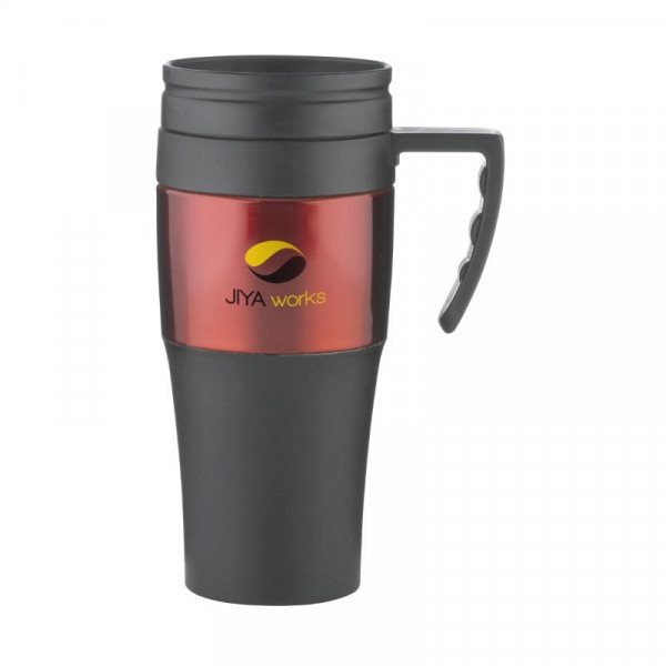Dubbelwandige, kunststof/RVS thermosbeker met schroefdeksel en schuif-/klikopening. Inhoud 450 ml. Per stuk in doos.
