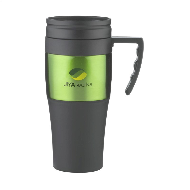 Dubbelwandige, kunststof/RVS thermosbeker met schroefdeksel en schuif-/klikopening. Inhoud 450 ml. Per stuk in doos.
