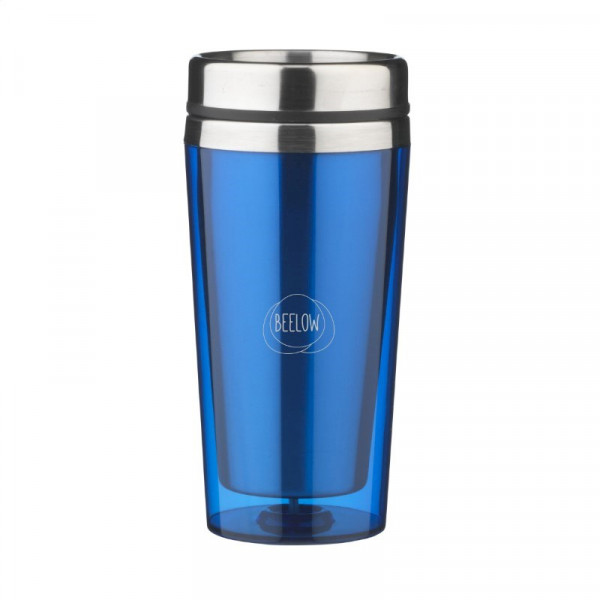 Dubbelwandige thermosbeker met RVS binnenzijde en kunststof buitenzijde, deksel met schuif-/klikopening en slipvaste onderzijde. Inhoud 500 ml. Per stuk in doos.