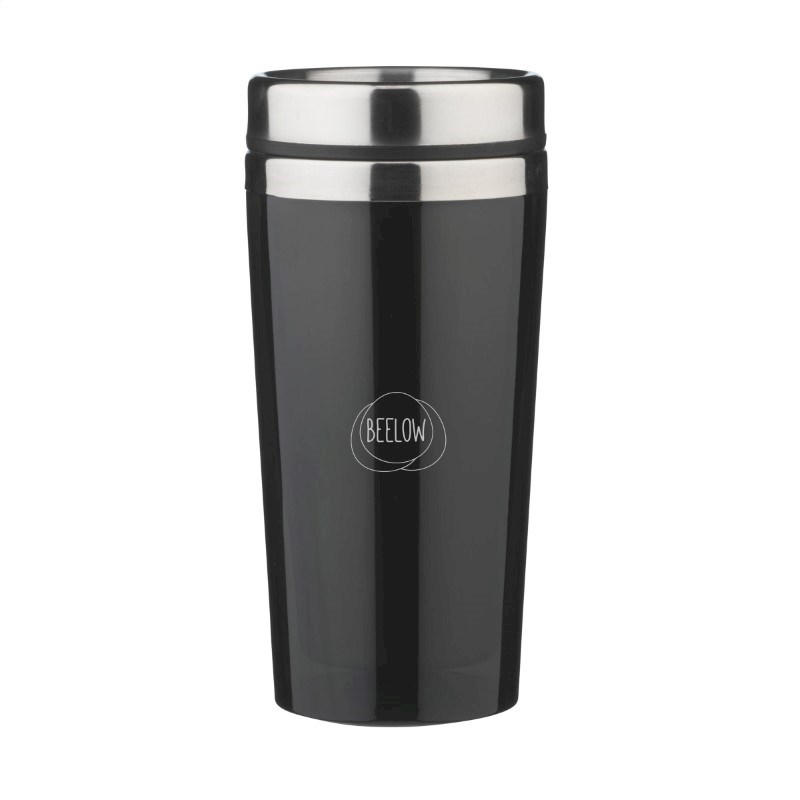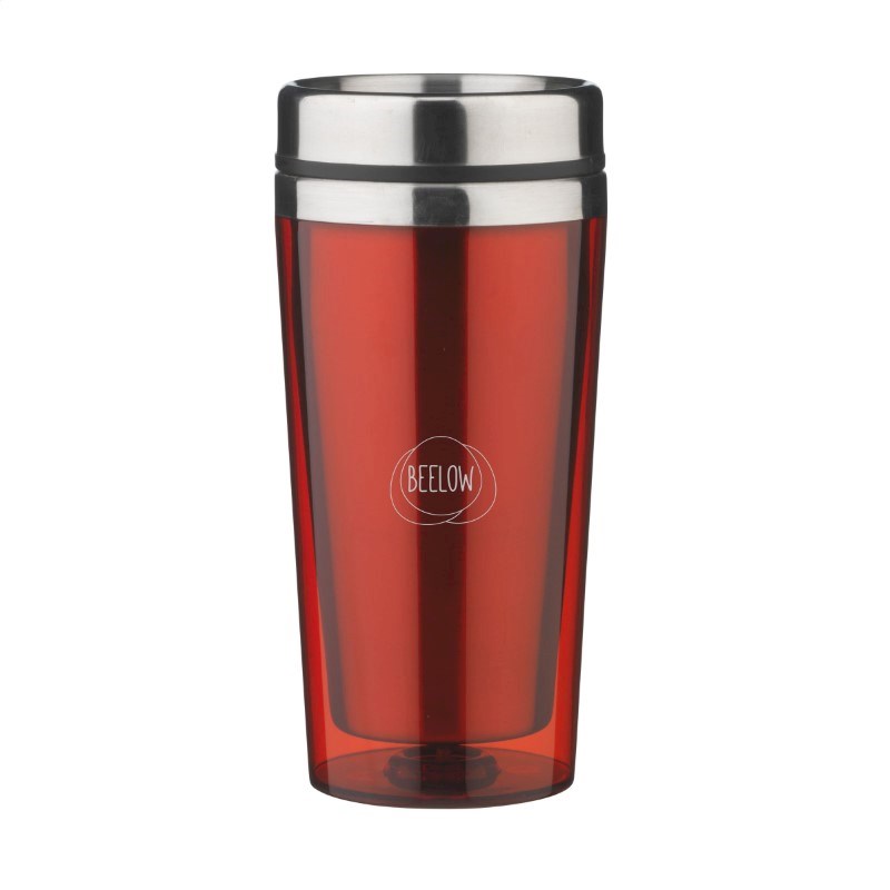 Dubbelwandige thermosbeker met RVS binnenzijde en kunststof buitenzijde, deksel met schuif-/klikopening en slipvaste onderzijde. Inhoud 500 ml. Per stuk in doos.